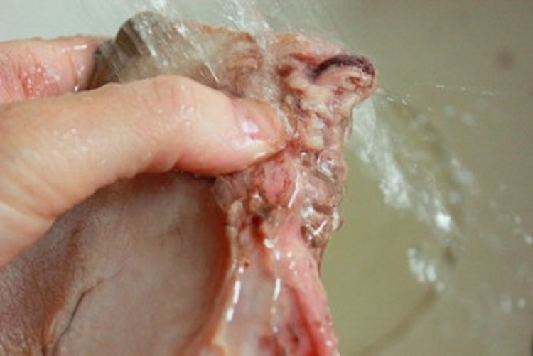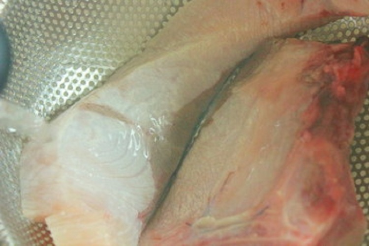- 4.すぐ流水で全体を冷し、アラに残った血合いやぬめり、ウロコなどの汚れを丁寧に取り除く。
