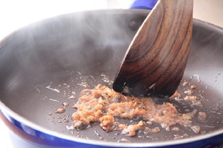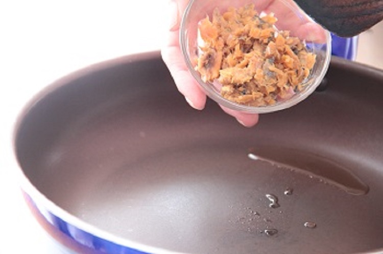 へしこは、ほぐす時点では骨を全部取り去ることは難しいので、炒めながらていねいに取り除くこと。脂が多く熱を持ちやすいので菜箸を使って取り除くとよい。