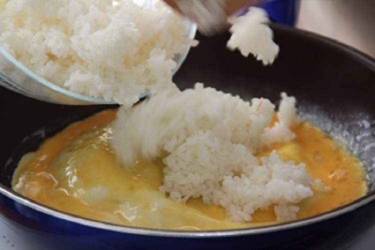 4、再びフライパンに油を適量しき、卵を加える。その卵が半熟状態になったらご飯を加えて炒める。混ぜ合わせたらボウルに取っておいたへしこを加える。