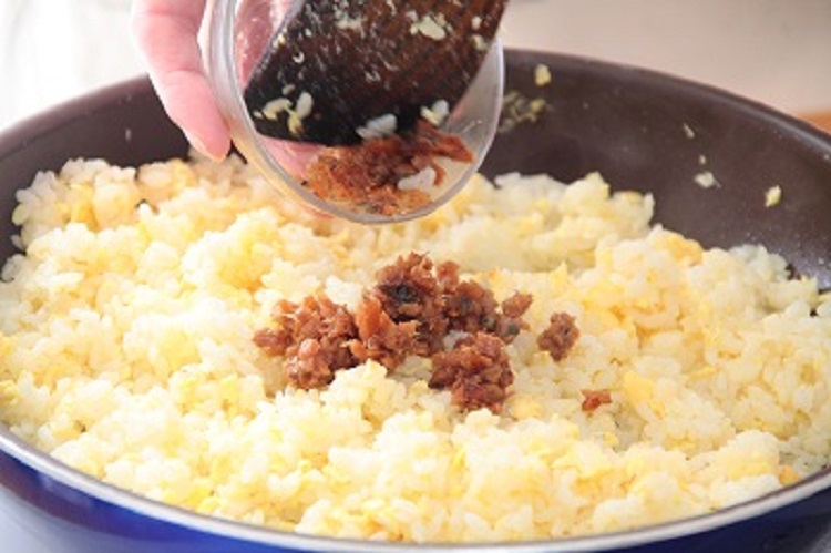 チャーハンには、冷やご飯を使うイメージがあるが、ご家庭で作る場合はあたたかいご飯にすること。ごま油を加えて混ぜることで、ご飯の風味がよくなる。