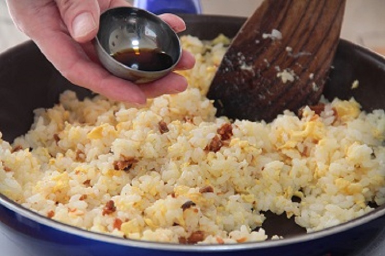薄口しょうゆで香ばしい香りをつけるため、必ず鍋肌から回しかけること。色味をきれいに仕上げたいので薄口醤油がおすすめ。味をみて足りなければ塩、こしょうで調味する。