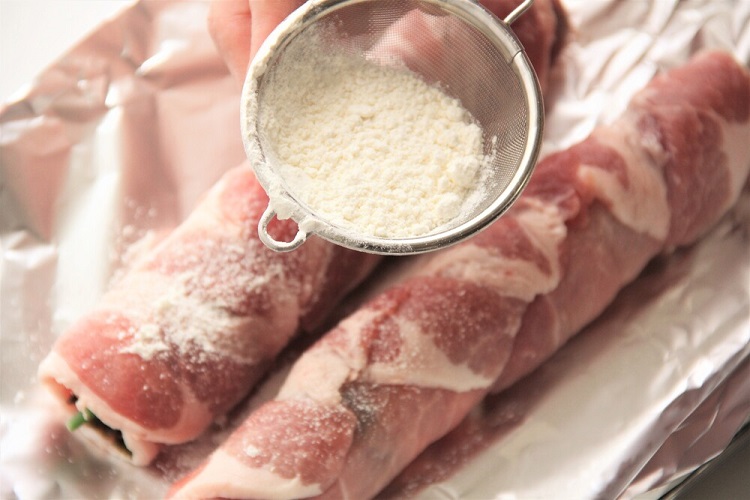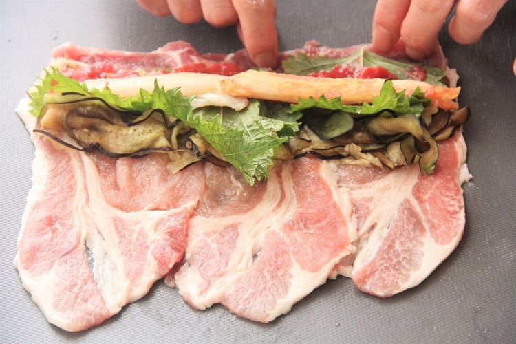 1、下味をつけておいた豚肉を重ね、15~20㎝幅の長さに並べて[A]の具材を巻く。
