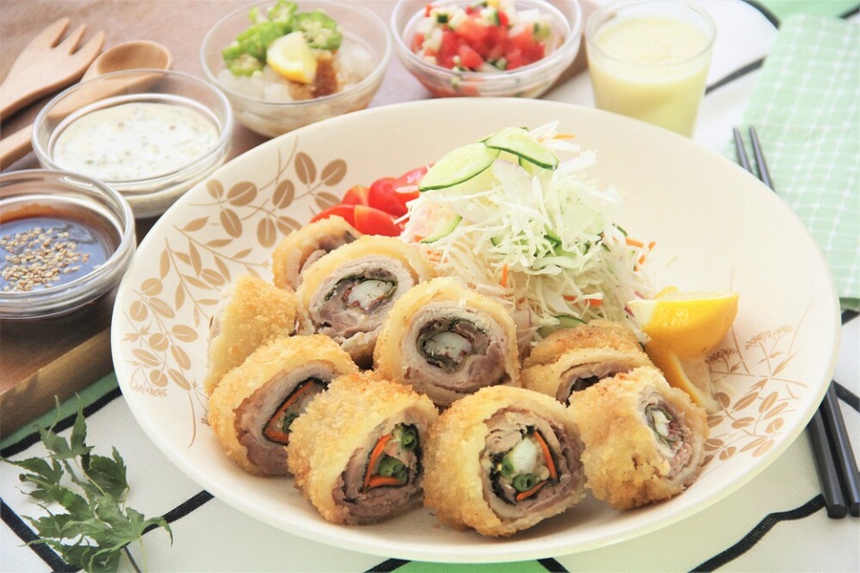 豚肉でカニと野菜を巻いたアレンジレシピ「カニの肉巻き棒カツ」を作ってみませんか。カラッと揚げた豚肉とカニ、野菜の相性が抜群です。油で揚げることで、野菜の甘みが増します。そのままでも十分美味しいですが、今回は5種類の特製ソースを用意しました。色んな味を楽しむことができるので、友人や家族にも喜ばれるはず。多めにストックで作っておけば、お弁当の立派なおかずになりますよ。ぜひ試してみてください。