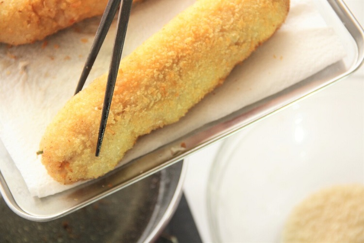 低温の180度の油でゆっくりと揚げる。あまりいじりすぎると衣がはがれてしまうので注意すること。