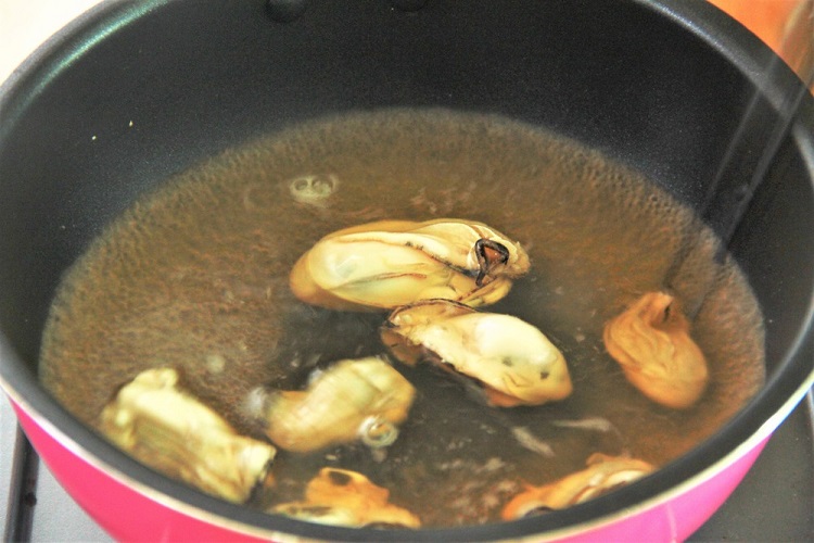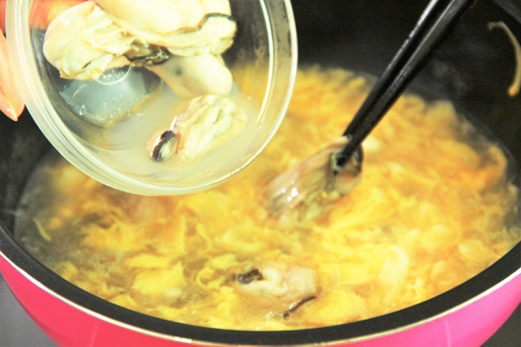 牡蠣は戻し入れることで、身が縮みすぎるのを防ぐことができる。牡蠣の量は好みに合わせて増減してもよい。
