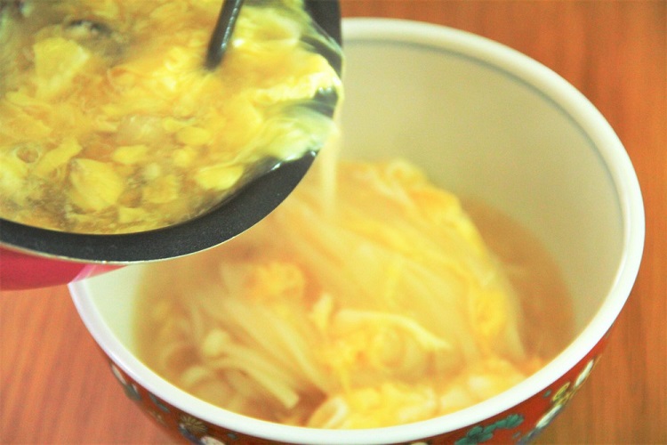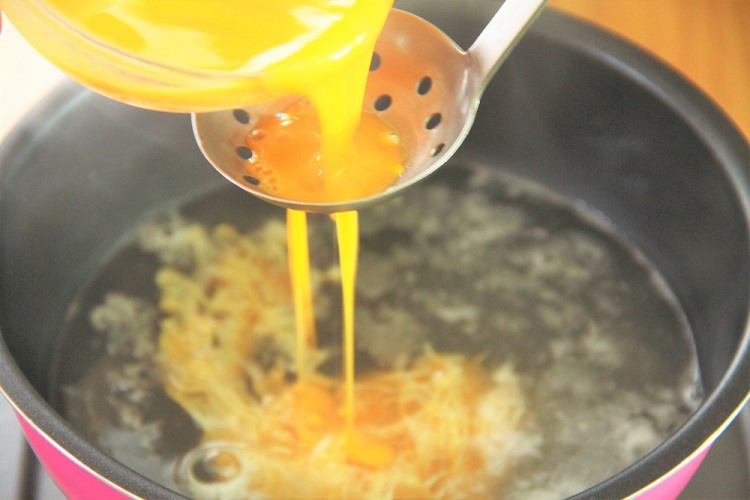 卵を加える際、網状の杓子を使うとよい。杓子がない場合、菜箸などを使って細めに卵を流し込むこと。できるだけ大きなダマにならないようにすると仕上がりがよくなる。火が入り過ぎると卵のトロトロ感がなくなってしまうので、火加減に注意すること。