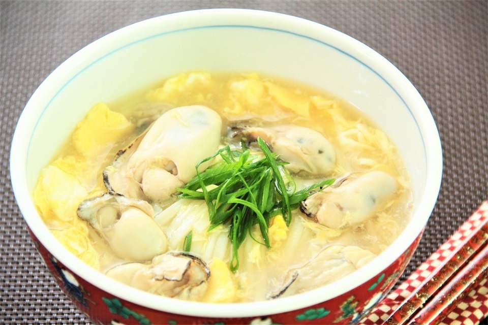 器には出汁を中心に注ぎ入れ、できるだけ最後にトロトロ卵、牡蠣を入れると見た目がよくなる。失敗しそうであれば、あらかじめあたためた牡蠣を取り出しておき、最後に盛り付けてもよい。