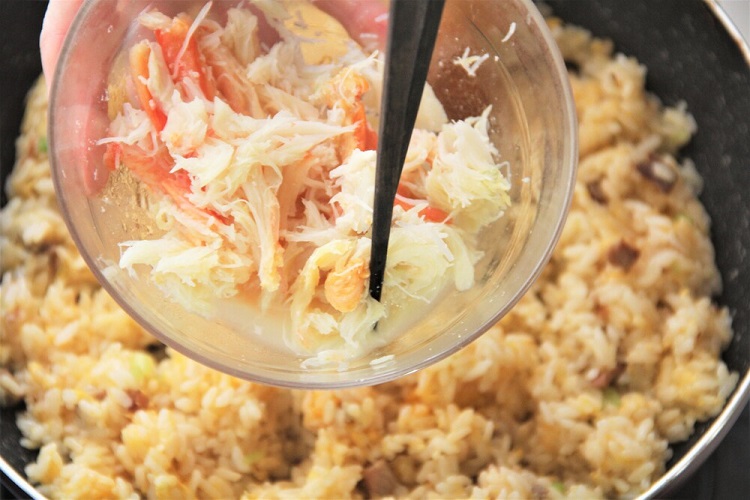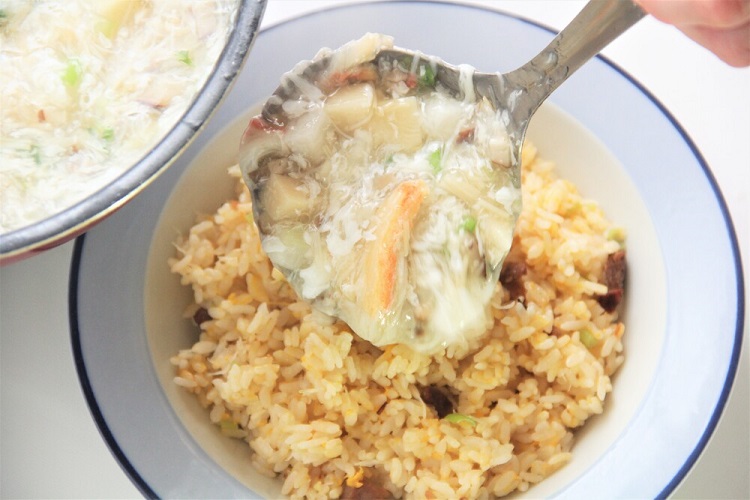4、チャーハンに3をかけたら完成。食べる直前にカニ殻のスープを温めて添える。
