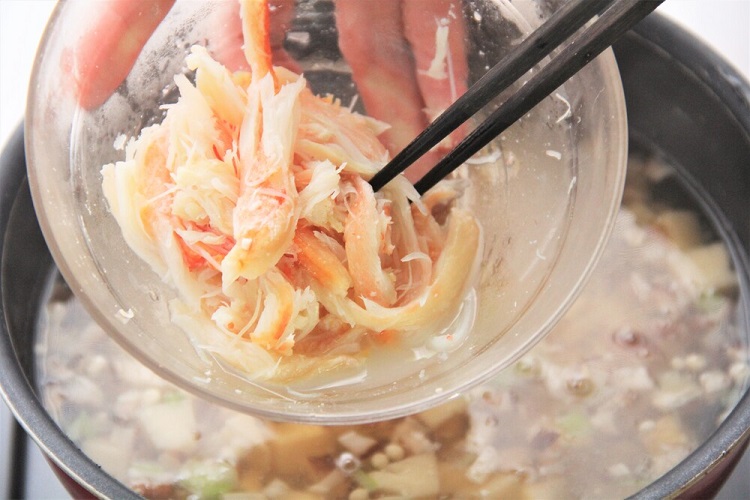 3、[カニのあんかけのあん]を入れた鍋を火にかけ、煮立ったら[具材]、カニを入れて煮る。ひと煮立ちしたら水溶き片栗粉、卵白を少しずつ加える。