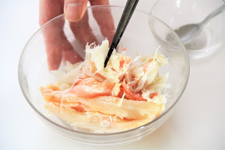 1、カニの身をほぐし、[カニの下味]をまぶしておく。