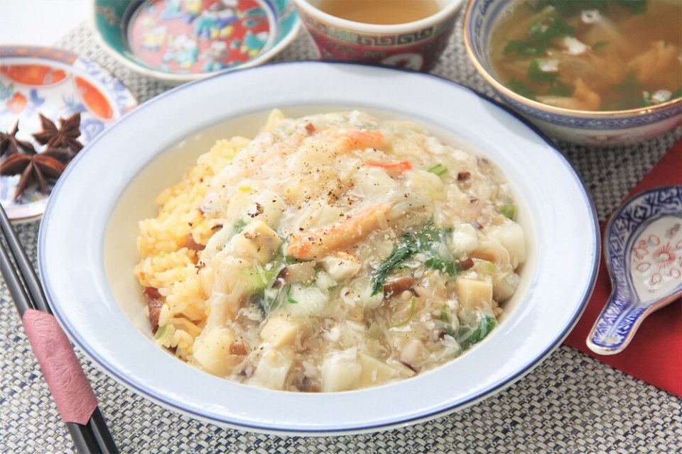 カニを使ったこだわりのあんかけチャーハンを作ってみませんか。本格的な中華料理店で提供されている白いあんかけは“淡雪(あわゆき)あんかけ”とも言われ、ツヤがあり、上品な見た目が特徴です。あんかけを作る際、卵白を最後に加えてふんわりと仕上げましょう。カニの殻はスープの出汁に活用します。ぜひ試してみてください。