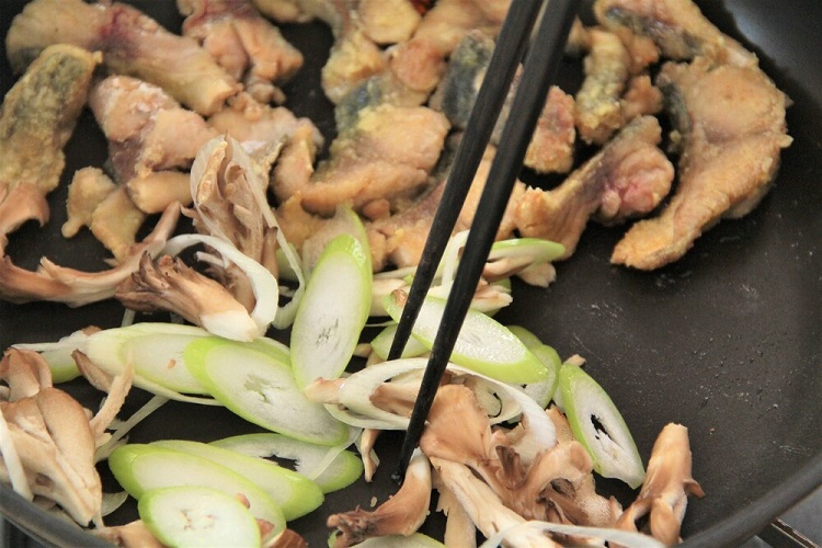 2、1のサバに焼き色がついたら弱火にして蓋をし、2~3分蒸し焼きにし、マイタケ、白ネギを加える。