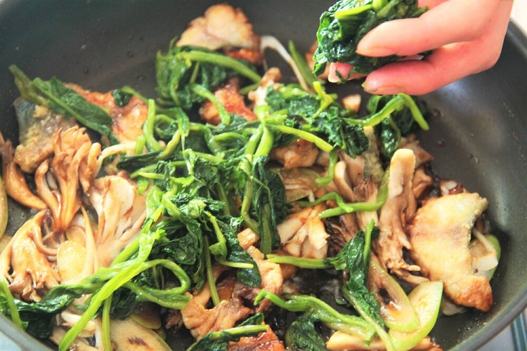 サバは蒸し焼きにして火を通すことで、ふっくらとした食感になる。マイタケはシメジやエリンギでも代用できる。野菜を増やす場合、マイタケと白ネギの量を増やしてもよい。