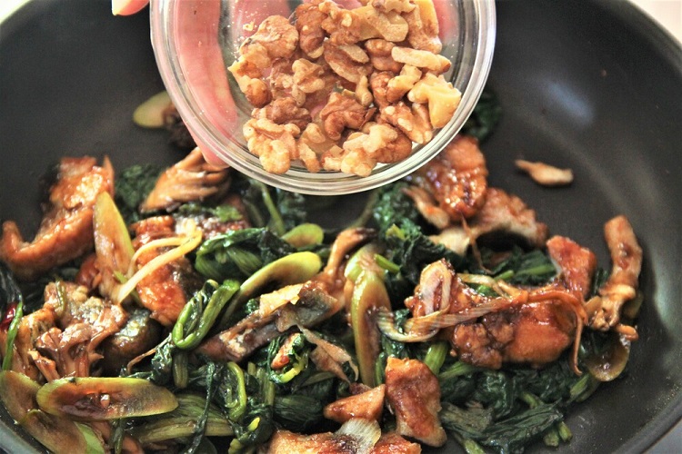 4、味が全体になじんだら器に盛り付け、炒って刻んだクルミをちらしたら完成。