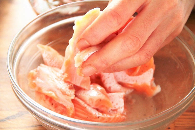 1、あらかじめ塩を振っておいたサーモンは水気をしっかりときる。