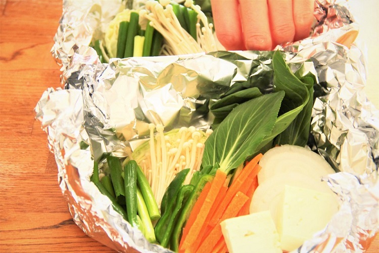 2、用意しておいたアルミホイルにチンゲン菜、キャベツ、玉ねぎ、エノキ、ニンジン、豆腐、ピーマン、青ネギをのせる。