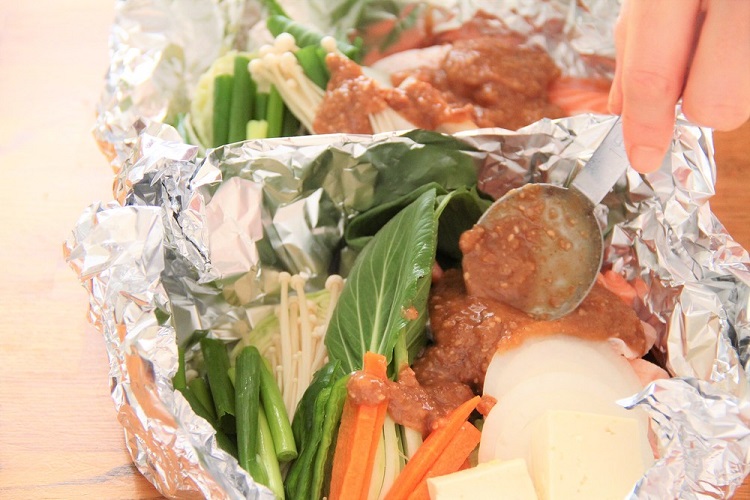 アルミホイルをフライパンに入れ、水を注いでおくと失敗しにくくなる。蒸し焼きにする時間は10分から15分ほどで調整する。完成後、もし味が足りなければ、塩・胡椒や醤油など調整し、好みで七味唐辛子や一味唐辛子、タバスコを振ってもよく合う。