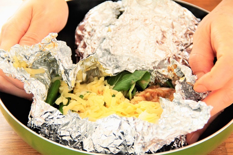 4、3にチーズをのせ、アルミホイルをかぶせる。フライパンにのせ、蓋をして10分ほど弱火で蒸し焼きにし、バターをのせたら完成。