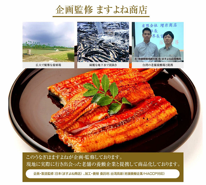 うなぎ蒲焼き(ニホンウナギ 台湾産):しょうゆ、ぶどう糖果糖液糖、発酵調味料、水あめ、砂糖、うなぎエキス、着色料(カラメル・アナトー)、増粘剤(加工澱粉、増粘多糖類)、調味料(アミノ酸等)、(原材料の一部に小麦、大豆を含む)