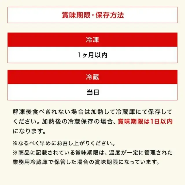 家庭用冷凍庫の場合、業務用冷凍庫に比べ保存温度が高いため品質が損なわれる可能性がございます。