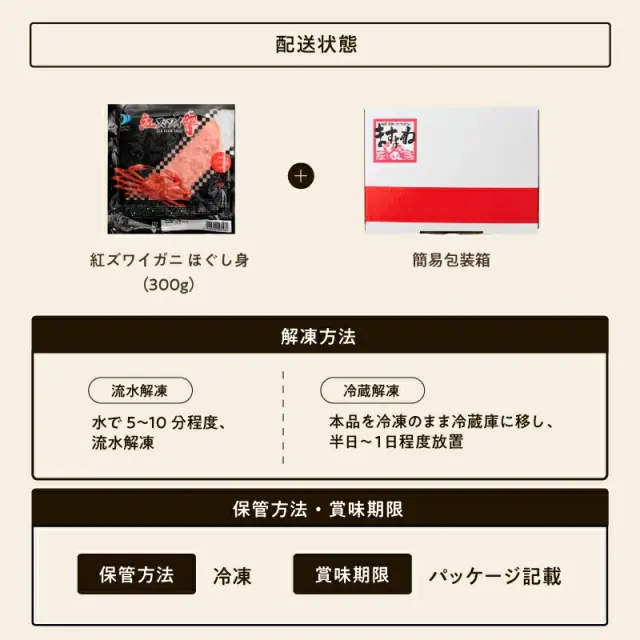 【原材料】紅ズワイガニ(国産および韓国産)、食塩/甘味料(ソルビトール)、酸味料、調味料(アミノ酸)、酸化防止剤(ビタミンC)
