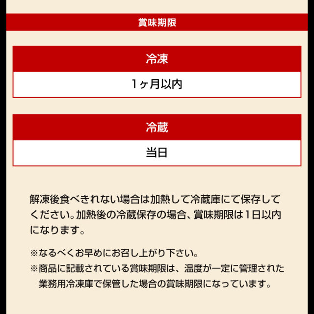 冷凍:1ヶ月(推奨1週間)以内 (冷凍-18℃以下で保存)