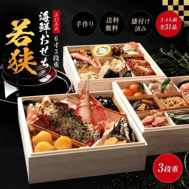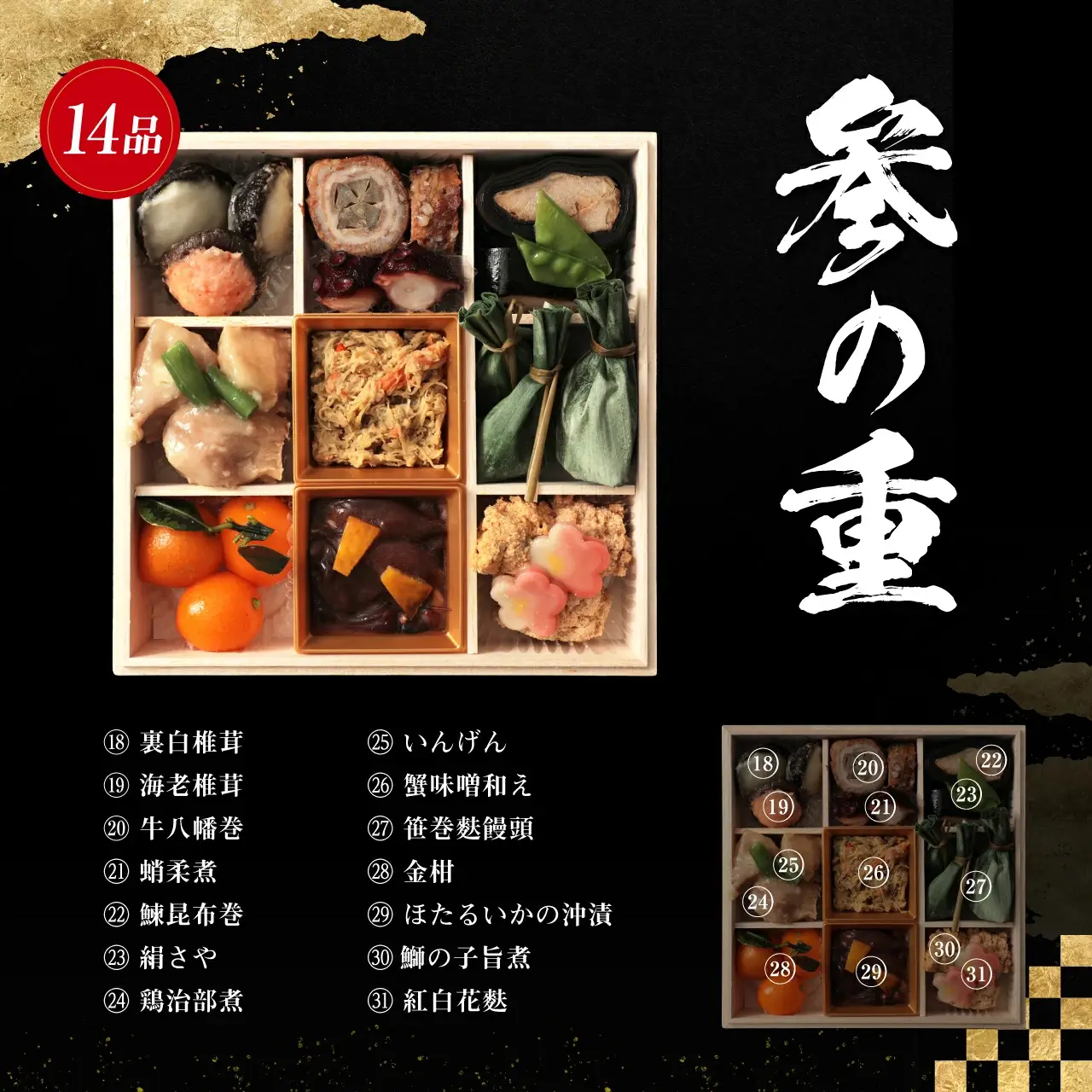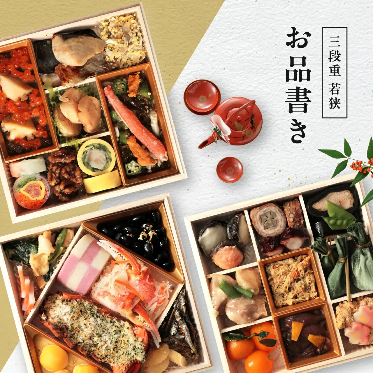 おせち×3段/お品書き・解凍方法/風呂敷/木製重箱