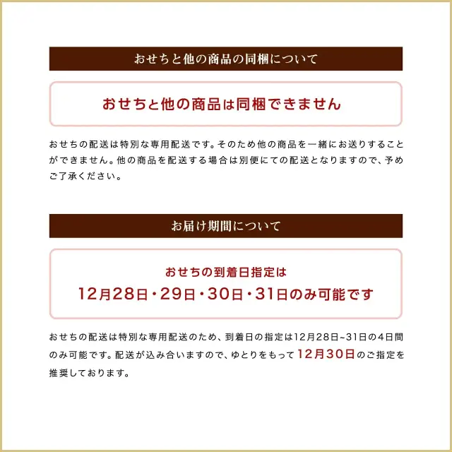 年末受付開始致しました!配送日選択よりご希望の配送日をご選択下さいませ。(一部商品に付きまして配送指定日不可の商品もございます。)また、ご希望の配送日が2週間以上先の場合、システムの都合上先に請求を上げさせて頂きますので予めご確認・ご了承お願い致します。